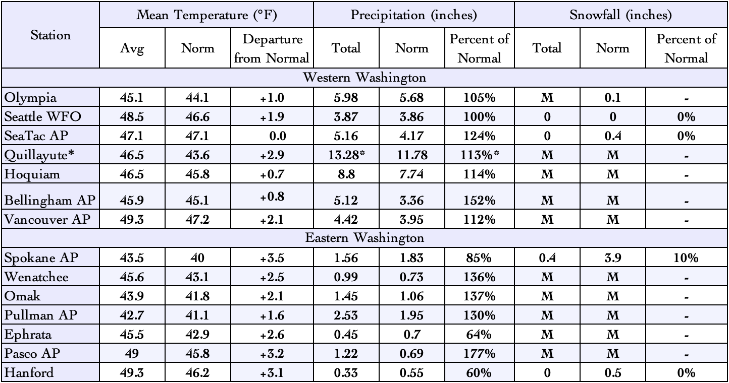 March 2025 climate summaries for locations around Washington with a climate normal baseline of 1991-2020. M denotes missing data. *Quillayute is missing 5 days of precipitation data. True precipitation for this site is likely greater than what is shown here.