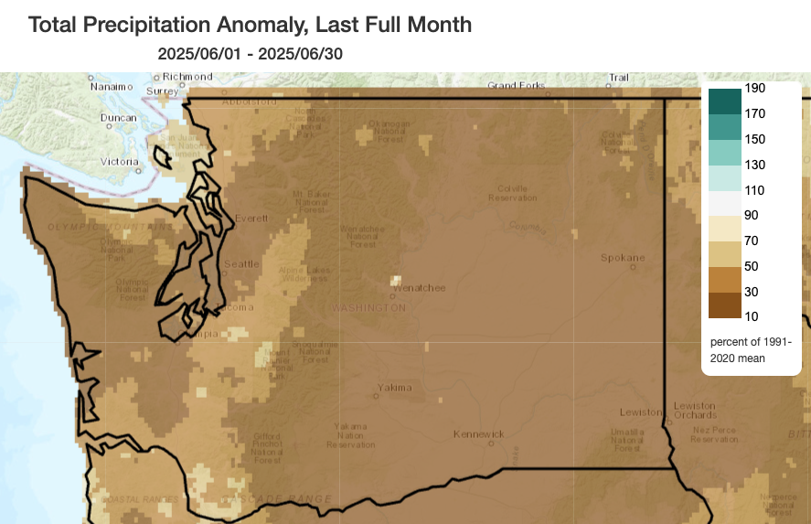 June was the third consecutive month with below normal precipitation statewide in Washington. June 2025 ranked in the top 10 driest Junes on record back to 1895. Statewide, precipitation averaged well below the 1991-2020 statewide average of 1.93”. The vast majority of the state experienced less than 30% of normal precipitation (dark brown shading on the precipitation map below), with 30-70% of normal precipitation measured only in small portions of the western slopes of the Cascades, northern slopes of the Olympics, and the southern I-5 corridor. Many stations fell within the top 10 driest June totals in their period of record, and large portions of eastern Washington received no measurable precipitation at all throughout the month.