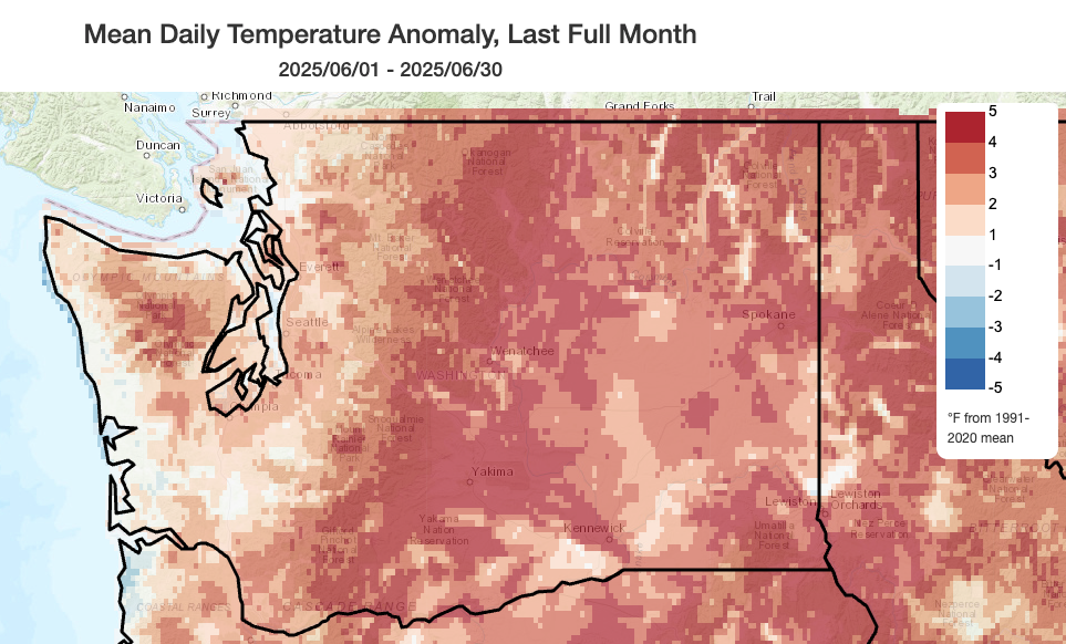 June 2025 climate summaries for locations around Washington. Anomalies are relative to a climate normal baseline of 1991-2020.