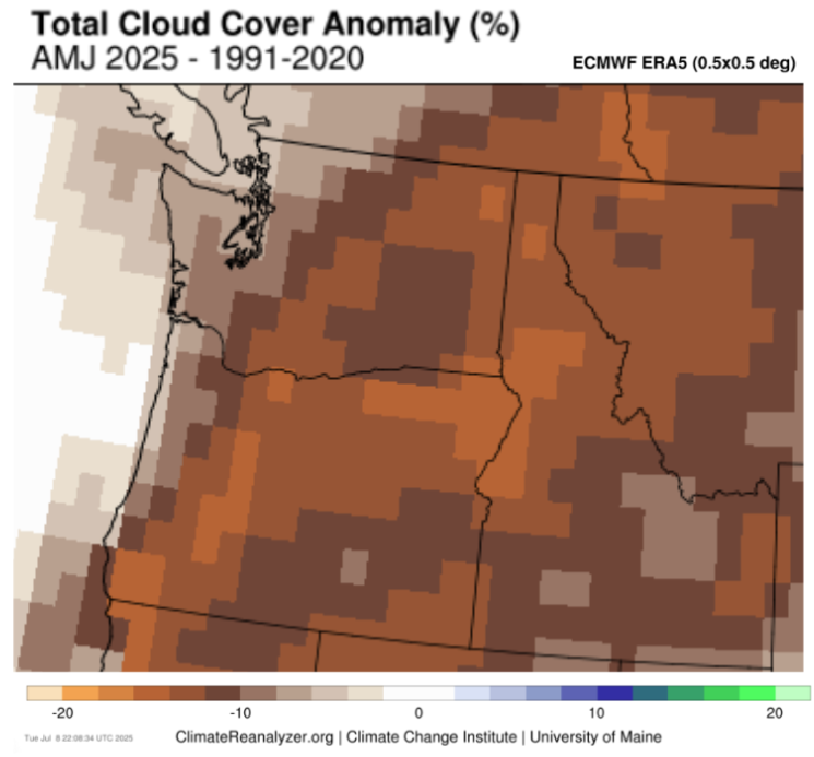 Widening out to the state as a whole, the map below shows cloud cover anomalies for April through June 2025 as a percent of 1991-2020 normals. Cloud cover is below normal for this period statewide, with deficits approaching 14% below normal for the far southeastern and northeastern corners of the state. Across eastern Washington as a whole, cloud cover was 10-14% below normal, and across western Washington cloud cover was 2-10% below normal. This excess sunshine contributes to worsening drought conditions as it causes more moisture to evaporate from soils and plants.