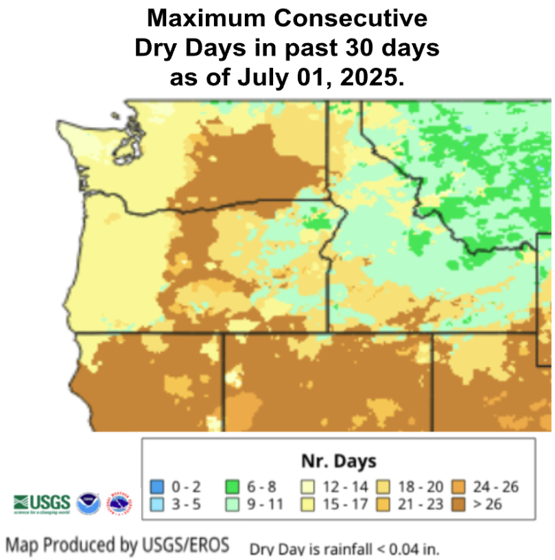 Some light precipitation fell on June 19-22nd across mainly western and far northeastern Washington, but this did little to offset the absence of rain throughout the rest of the month. A June 2025 map of the maximum consecutive dry days, defined as days with less than 0.04” of precipitation, reveals just how long many folks had to wait between rains. Across the Columbia Basin of eastern Washington, the brown shading on the map indicates 26+ days without precipitation with many spots observing no rain at all. Across western Washington, including the western slopes of the Cascades, the longest dry stretch occurred in the first half of the month when close to 14 days passed with no rainfall (medium yellow shaded areas on the map). A few lucky spots in the Okanogans and Rockies saw some slightly more frequent showers throughout the month, seen in small areas of green shading on the map.