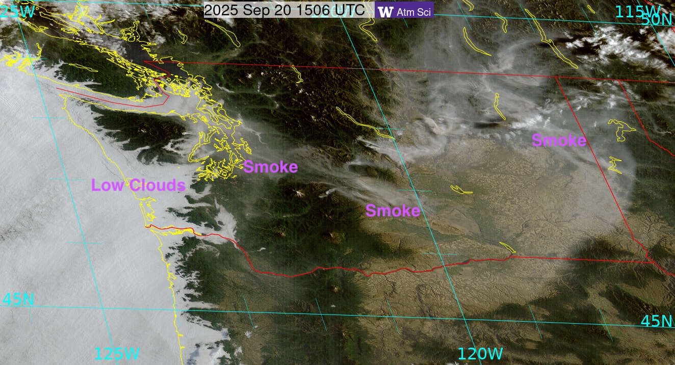 These fires led to prolonged smoke exposure across eastern Washington as well as some brief periods of smoke exposure across western Washington during easterly offshore wind events. On Sept 5th, a small, concentrated plume of smoke from the Wildcat Fire near Mt. Rainier produced some of the worst air quality observed in the north Seattle metro area in several years. Then on September 20-23 smoke returned to western Washington and Puget Sound as easterly winds brought more smoke in from eastern Washington down through the Cascades valleys, as seen on satellite imagery.