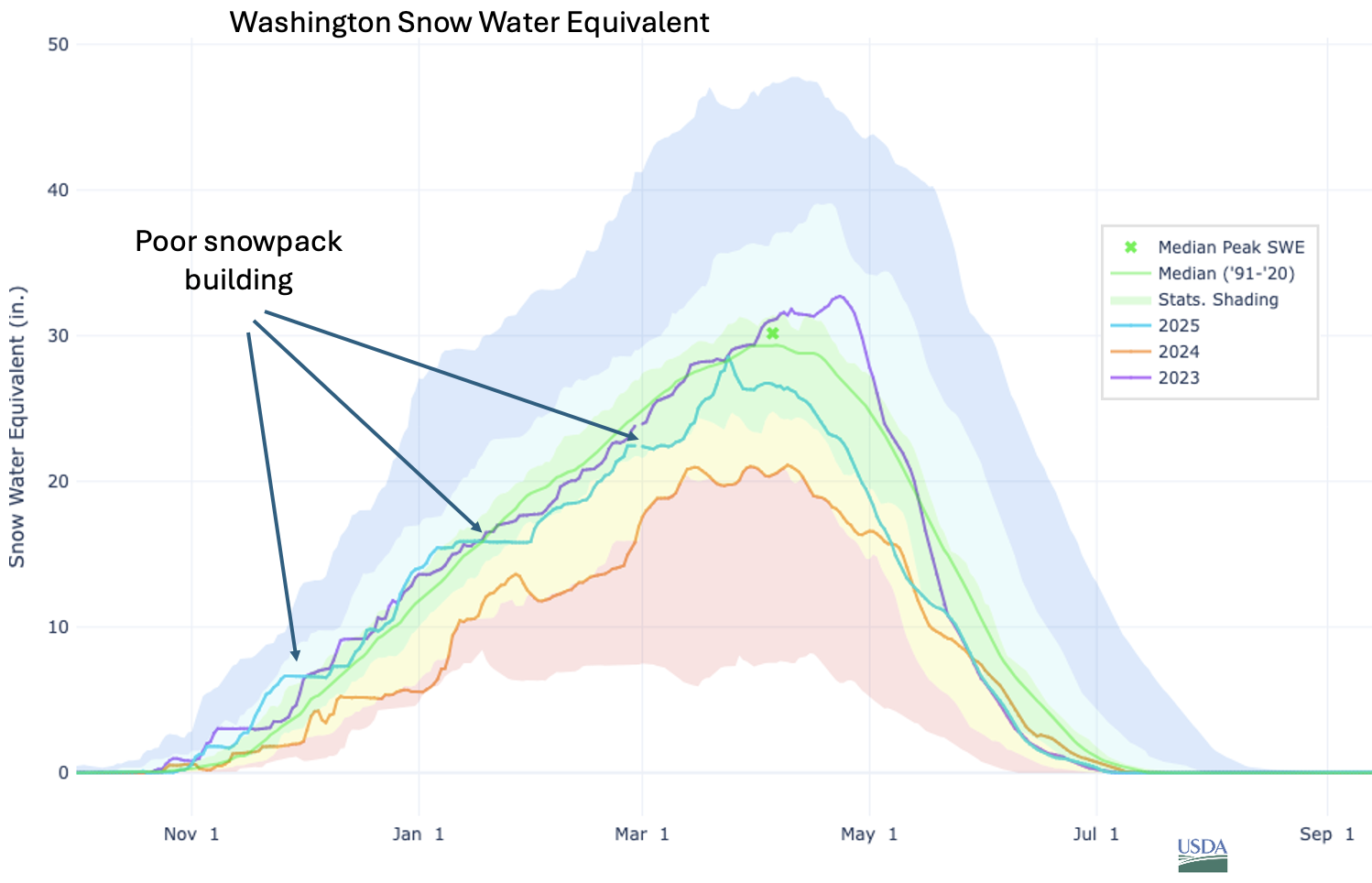 Averaging statewide, there was also below normal precipitation for each of the last three water years (2023: -6.75”; 2024: -4.57”; 2025: -4.97”), resulting in a total of about 16” of missing precipitation. And this is just the average for Washington. Individual basins have smaller or larger deficits. The Upper Yakima Basin, for example, received less than two and a half water years worth of precipitation over the span of three water years, amounting to about a 42” deficit in precipitation in that critical area.