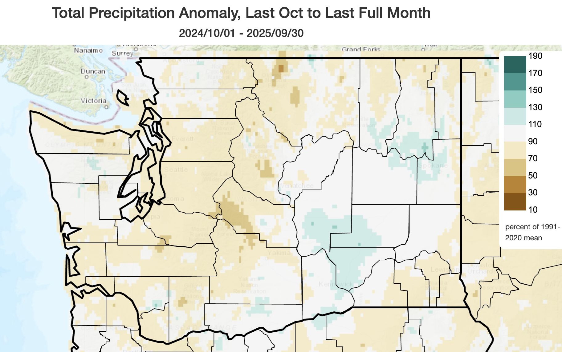 Water year 2025 is complete, and it’s time to take a look back and see how WA stacked up historically. The 2025 water year includes the 12 months from October 1, 2024 through September 30, 2025, as opposed to the usual calendar year. We use these months so we don’t split our wet season in two.