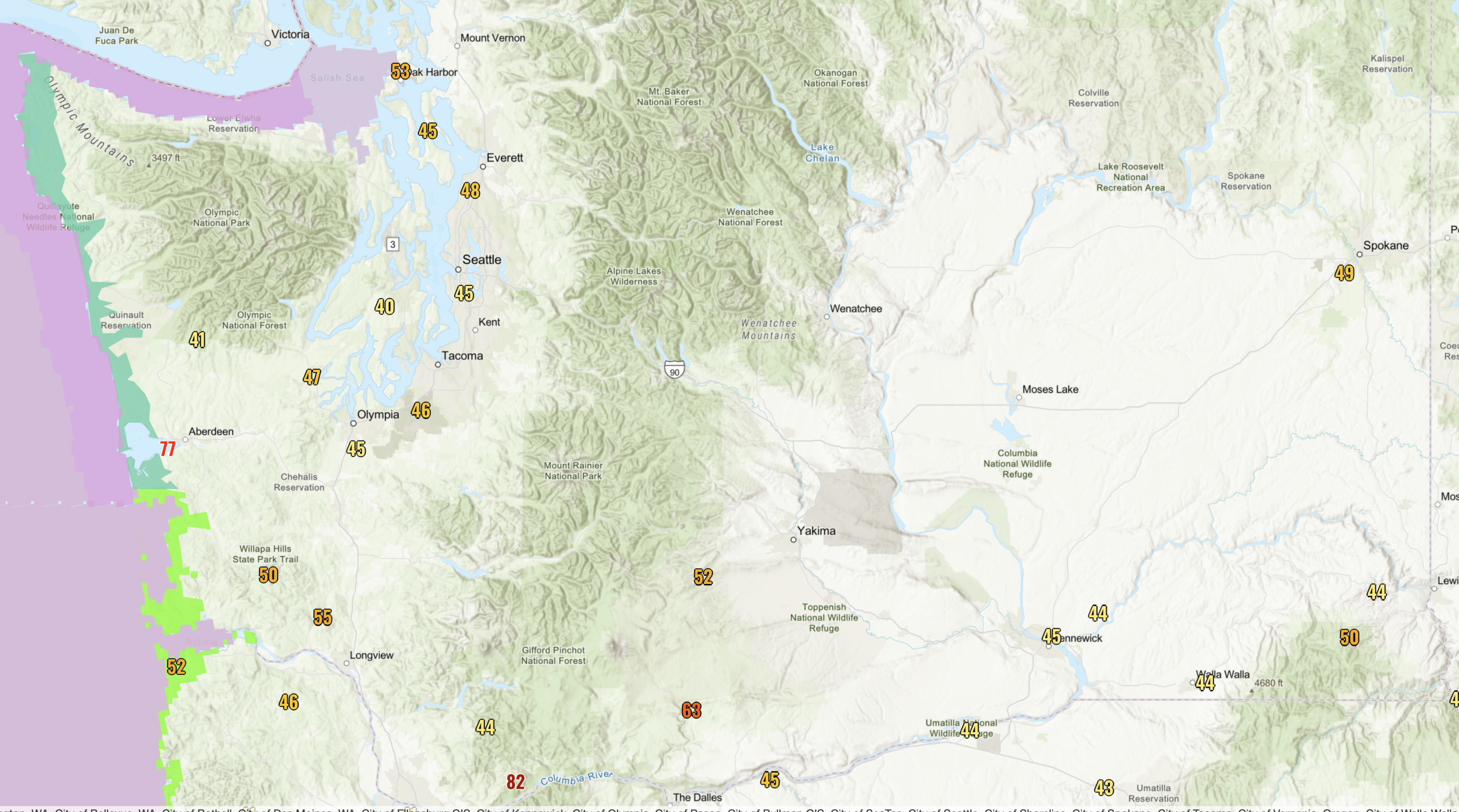 On October 24, a powerful atmospheric river brought widespread heavy rain to western Washington. SeaTac Airport recorded 1.04” of rainfall, marking the first calendar day to receive at least 1.00” of precipitation since April 26, 2024. That’s a streak of 546 days without a 1.00” daily rainfall total, and the third longest streak since records began in 1945. This storm also brought strong winds to the Pacific Coast, Puget Sound, the Strait, and across the Washington-Oregon border. On the 25th, a weather station near the Columbia Gorge recorded a gust of 82mph and Hoquiam Airport recorded a gust of 77mph. Gusts near 40-50mph were common throughout Puget Sound and across southern Washington as well.