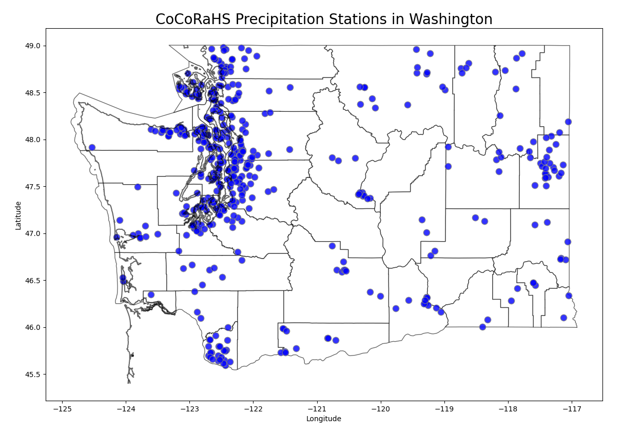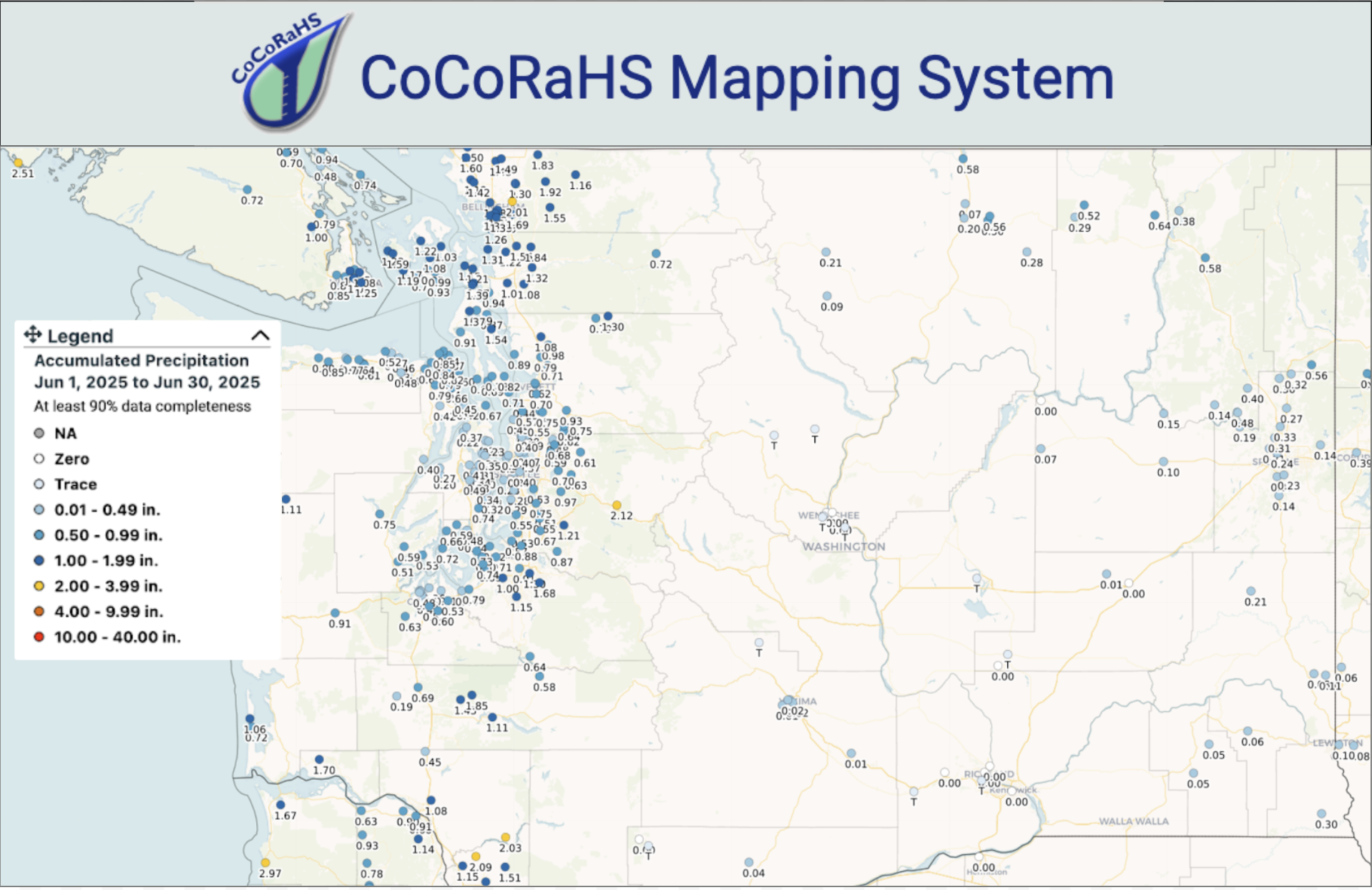 Map of active CoCoRaHS Observers as of 2025. The Washington State Climate Office serves as the statewide coordinator of the Washington CoCoRaHS Program.