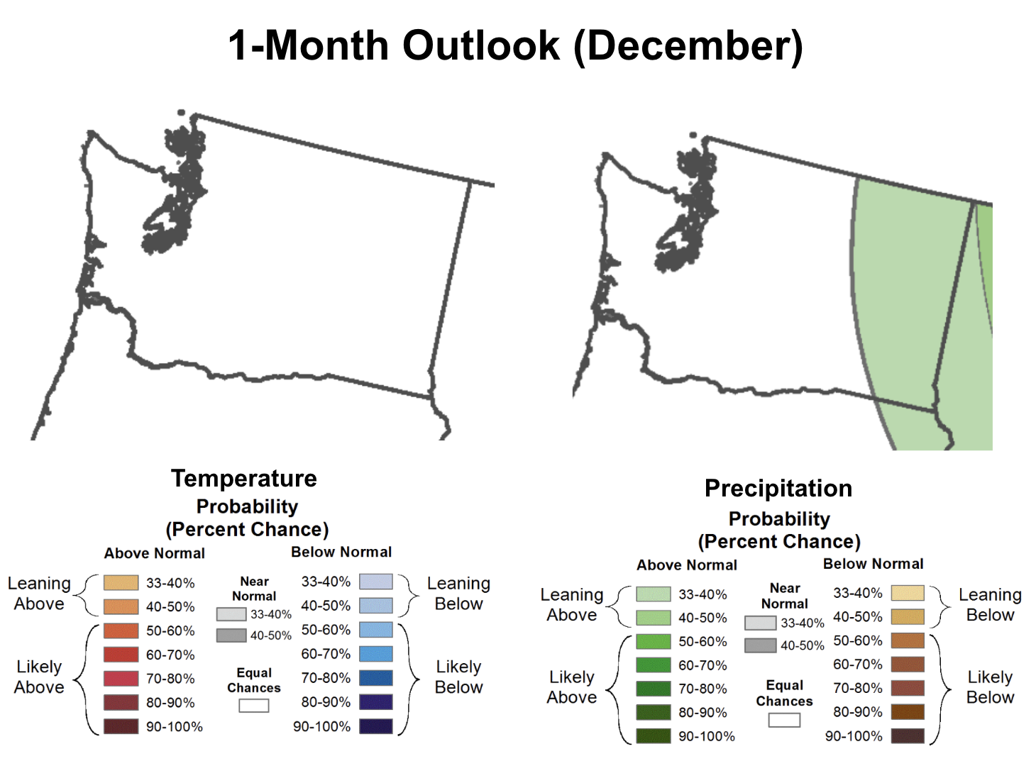 - December’s outlook indicates a slight chance of wetter than normal conditions in eastern Washington, but high uncertainty overall.