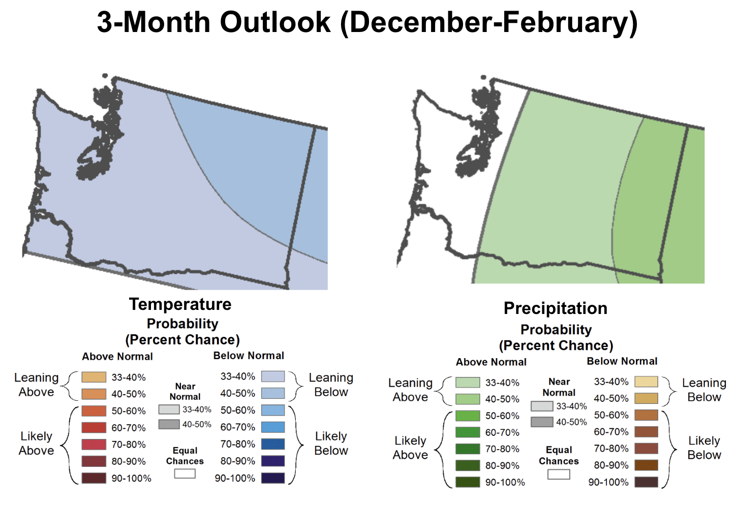 - The December-February outlook indicates cooler and wetter than normal conditions are most likely from the Cascades eastward. In western Washington, cooler than normal temperatures are most likely, but there is high uncertainty in precipitation for the period.
