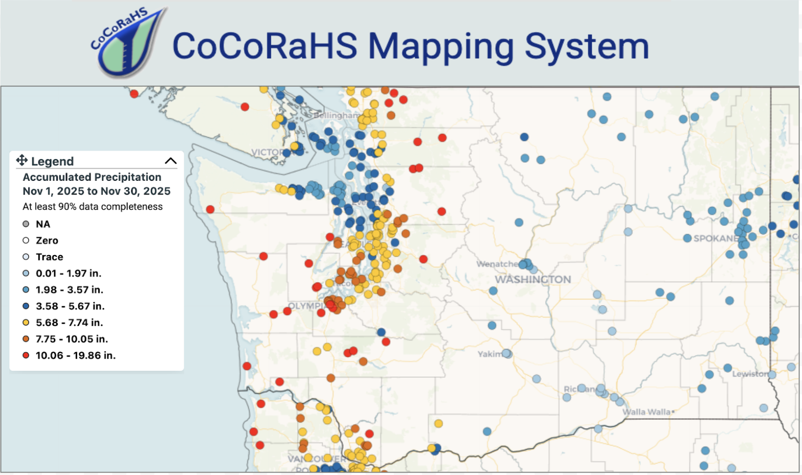 Another notable atmospheric river brought heavy rain to western Washington from November 5-8 with daily rain totals of 3-6” across the Olympics and Cascades. A consistent drumbeat of more typical weather systems then continued through the rest of the month. This CoCoRaHS map of monthly rain totals below illustrates statewide rainfall nicely. Rain totals exceeded 10” in the Olympic Peninsula and the windward side of the Cascades with reports near 6-8” across Puget Sound and the Vancouver-Portland metro.