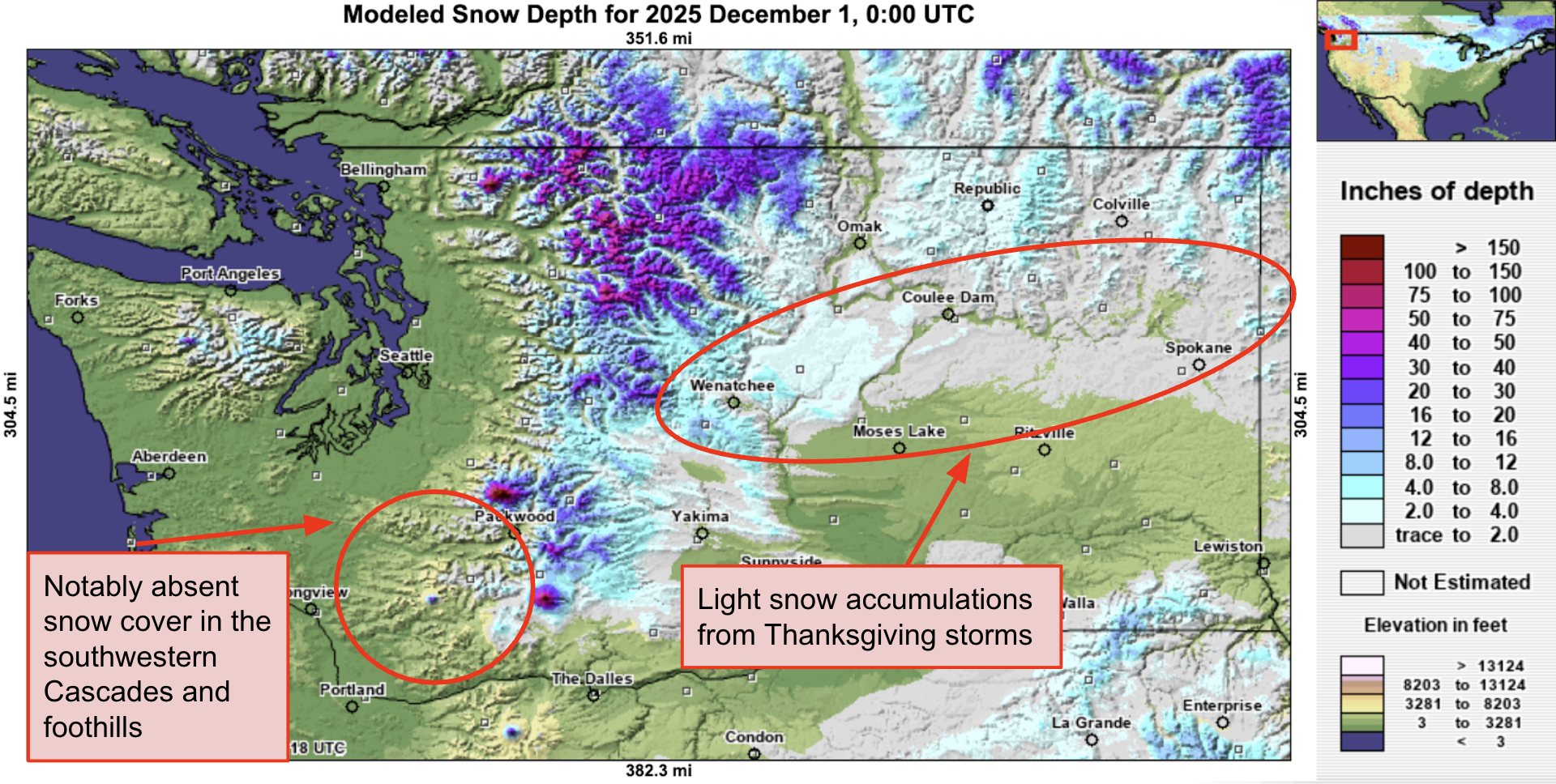 A couple of storms around Thanksgiving brought moderate snow to the Cascades and northeastern mountains. Multi-day snow totals were 12.0” at Paradise on Mt. Rainier, 13.0” at Snoqualmie Pass, 4.6” in Mazama, and around 1.0” for areas north of the I-90 corridor through eastern Washington. Minor snow (Trace-2.00”) can be seen across this region of eastern Washington, shaded in gray on the map of snow depth below. This active snowfall coupled with patchy freezing fog made for challenging holiday travel conditions at times across eastern Washington.