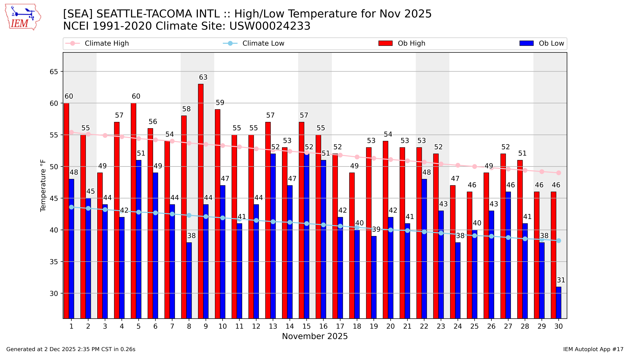 Temperatures were above average statewide in November, and these warm temperatures are reflected in graphs of daily high and low temperatures at Seattle-Tacoma Airport and Spokane.