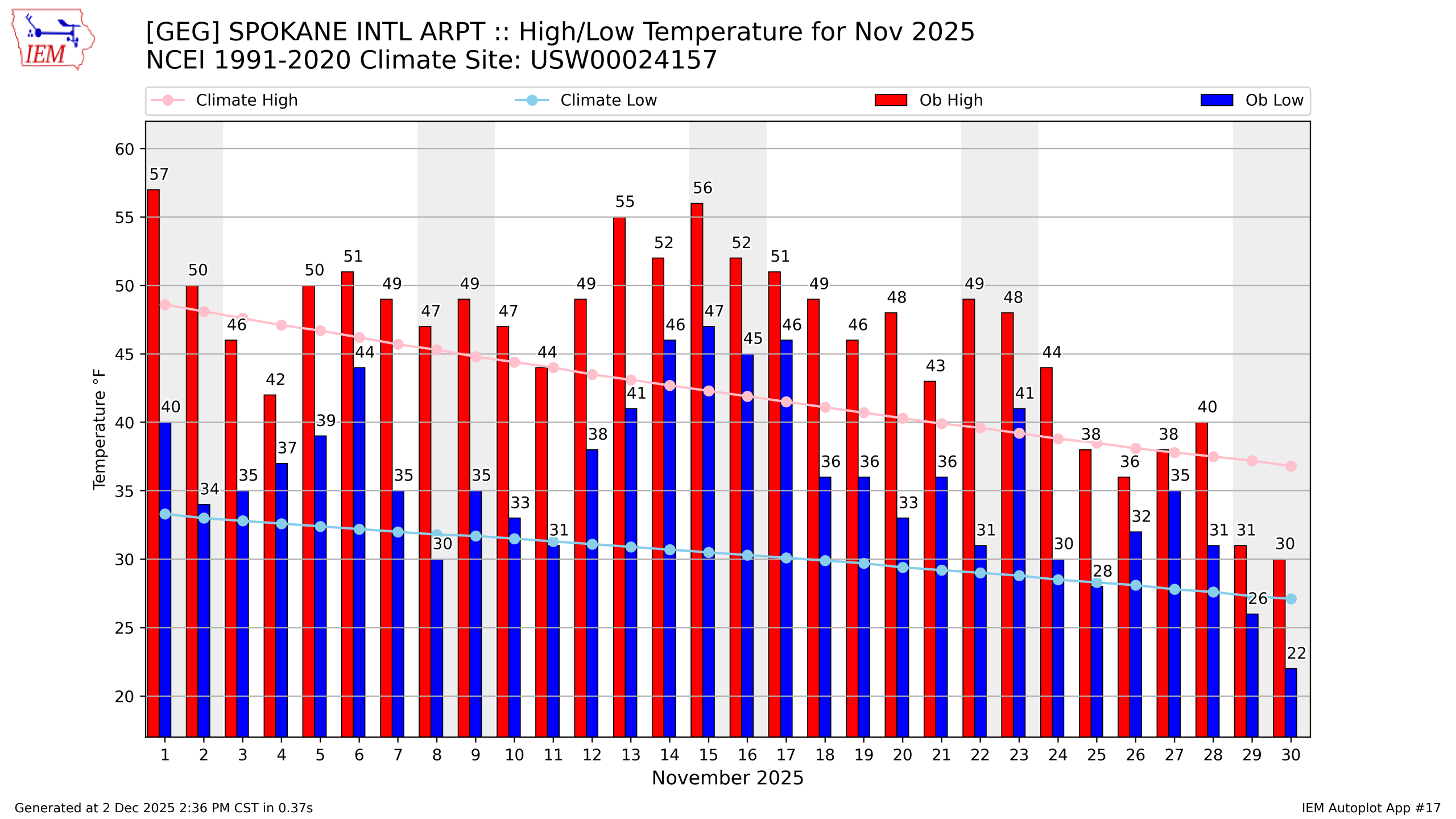 Daytime maximums consistently rose above long-term averages, and nighttime minimums were even more impressive. From November 14-17, minimum temperatures failed to drop below 45 degrees for 4 days in a row at Spokane International Airport. This has only happened two other times in November since 1881 at this station, including a 4-day stretch in November of 2008 and a 6-day stretch in November of 2014.