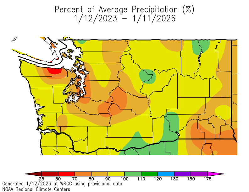 Multi-year (January 2023-January 2026) percent of average precipitation in Washington. This includes the recent flooding event.