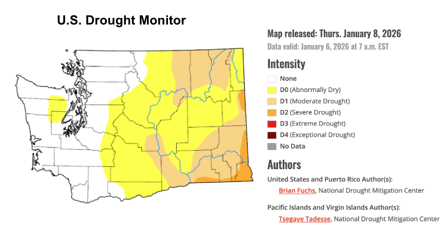 As of January 6, D1 moderate drought conditions remain across parts of the lower Columbia Basin, southeast Washington near the Blue Mountains and in the Okanogan Highlands.