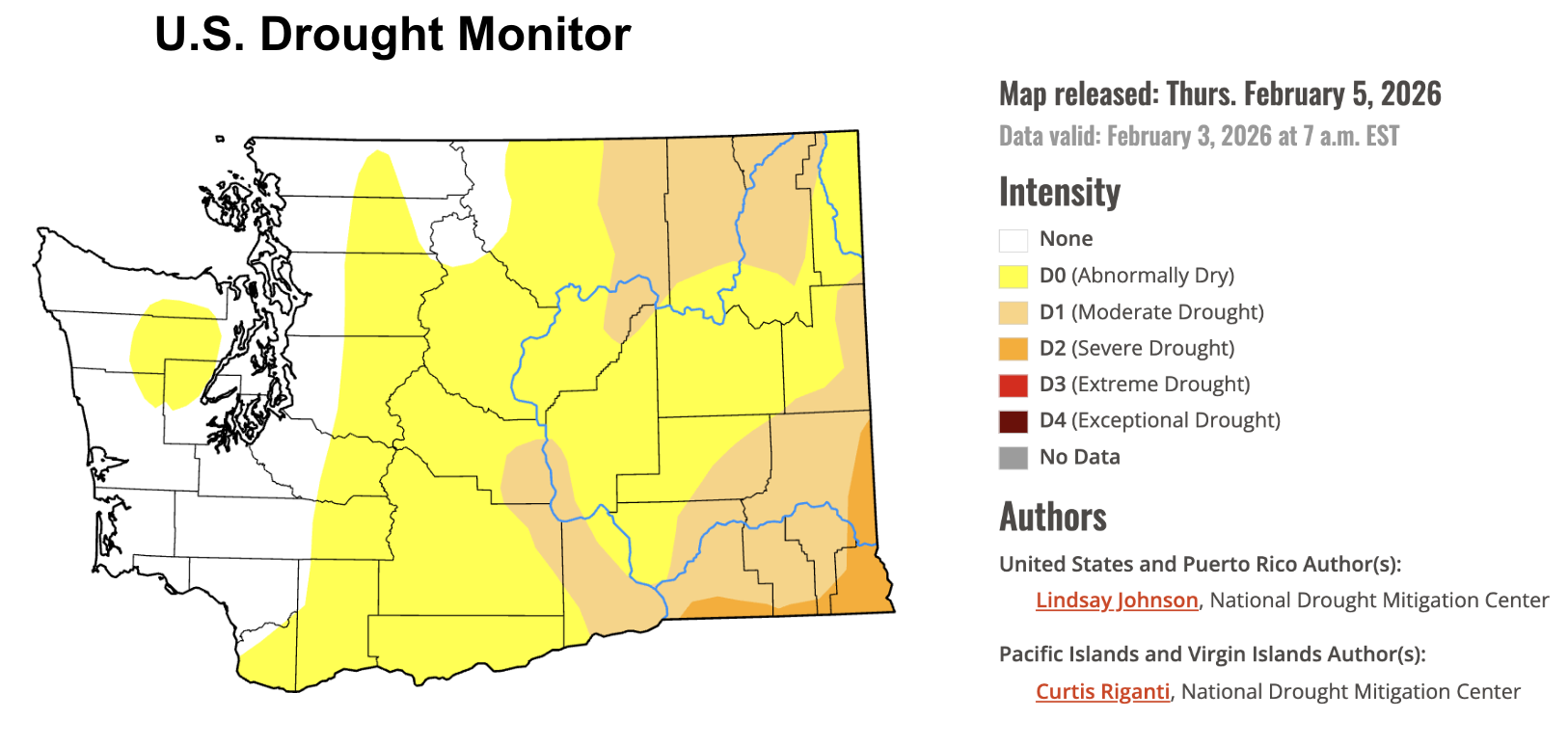 U.S. Drought Monitor for Washington. Data valid on February 3, 2026.