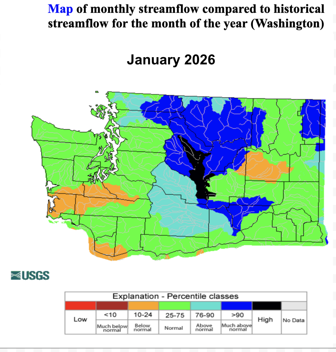 For rivers not primarily fed by snowmelt, such as the Chehalis, monthly streamflow in January was below normal due to the lack of rainfall during the month.