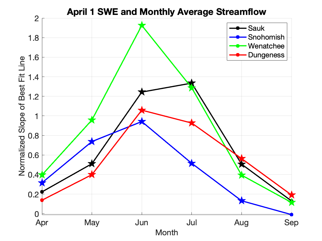 To answer that question, I examined the relationships between basin-average April 1 snow water equivalent (SWE/snowpack) and monthly average streamflow for a handful of rivers in Washington. Instead of presenting correlations, I’m showing the slope of the best fit line to show how much actual influence snowpack has on flow on each river each month – this gets at the idea of the “effect size”.