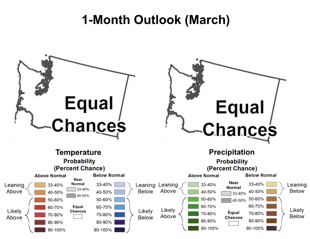1-month (March) outlook for temperature (left) and precipitation (right) in Washington State.