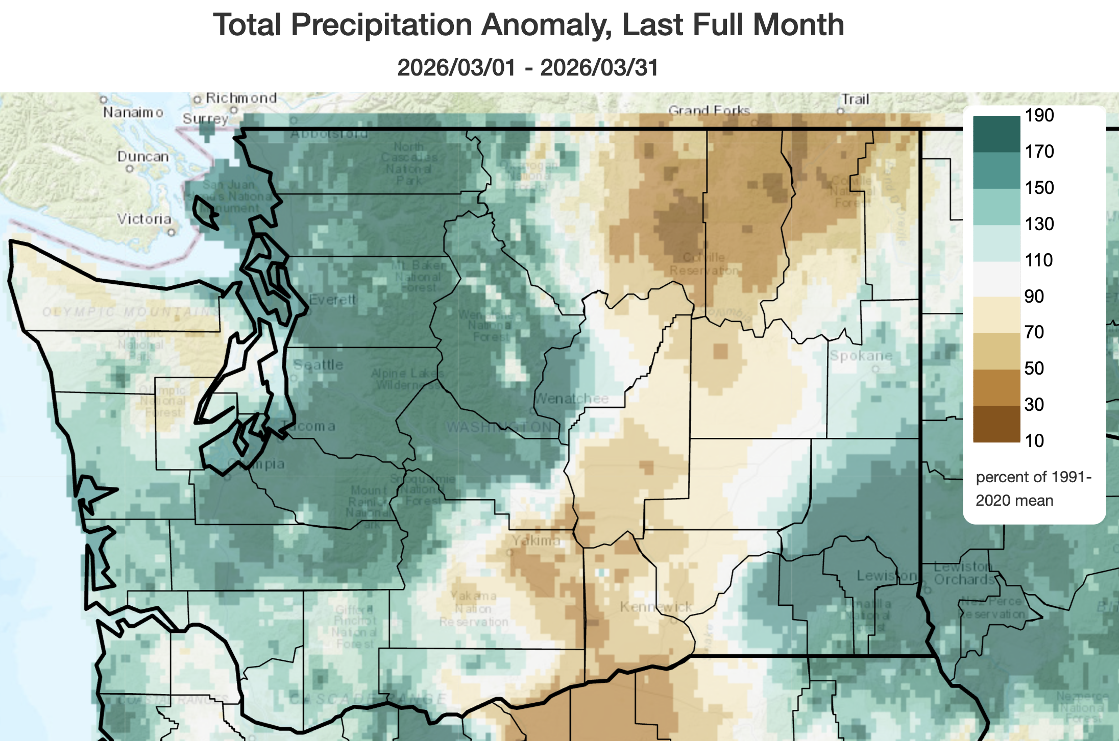 Below normal precipitation occurred across Okanogan, Ferry, and Stevens counties in the northern tier of the state and in the Columbia Basin from Yakima to the Tri Cities. Slightly below normal precipitation occurred on the northern and eastern slopes of the Olympics. Although a wet March is helpful for improving drought conditions, many reservoirs were unable to collect runoff as they were already nearly full and needed to retain capacity to capture spring snowmelt and prevent snowmelt-related spring flooding.