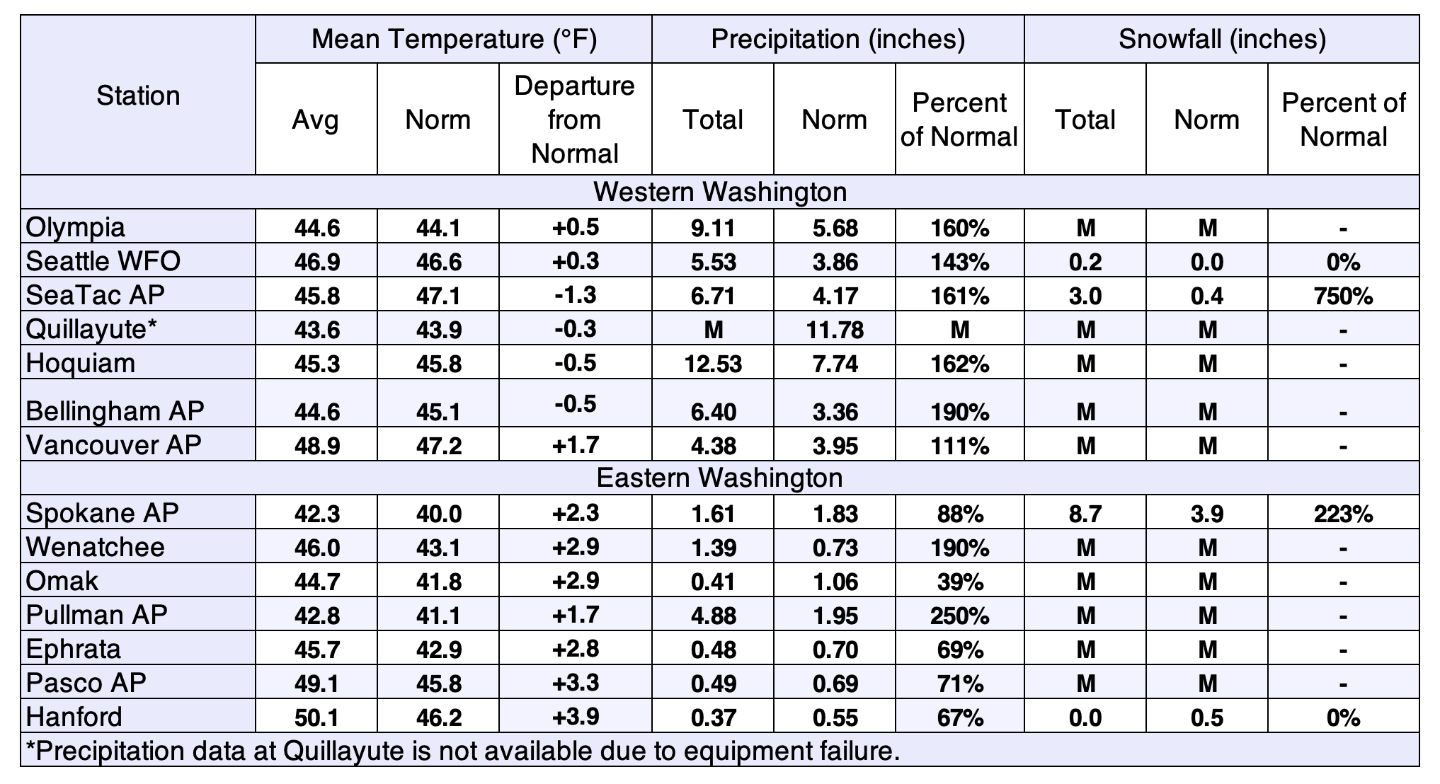 - Near-record monthly precipitation occurred across the eastern shores of Puget Sound and in the western slopes of the Cascades. Well above normal precipitation also occurred in the southeastern corner of the state near Pullman.