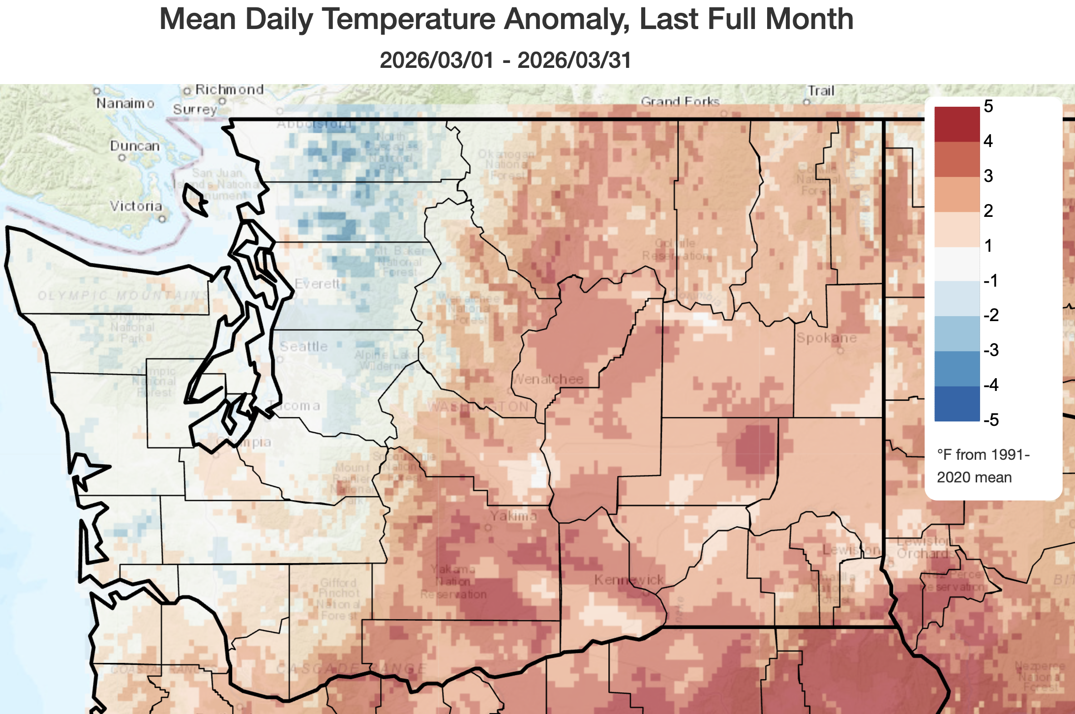 March 2026 climate summaries for select locations around Washington. Anomalies are relative to a climate normal baseline of 1991-2020.