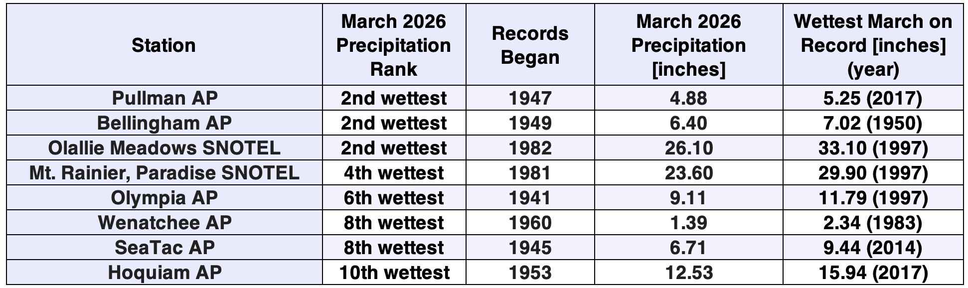 March 2026 precipitation rankings for select stations across Washington.