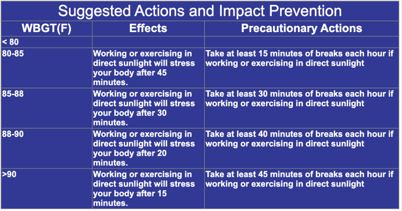 Table 1: WBGT thresholds, impacts, and suggested actions from NWS Tulsa.
