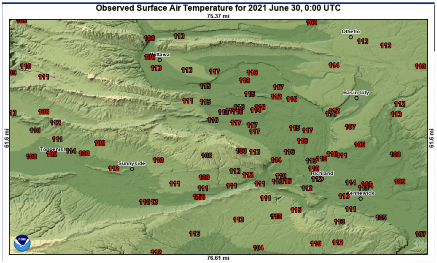 Figure 1: Temperature observations at 00 UTC 30 June 2021 (5 pm local time) in the Lower Columbia Basin from NOHRSC.