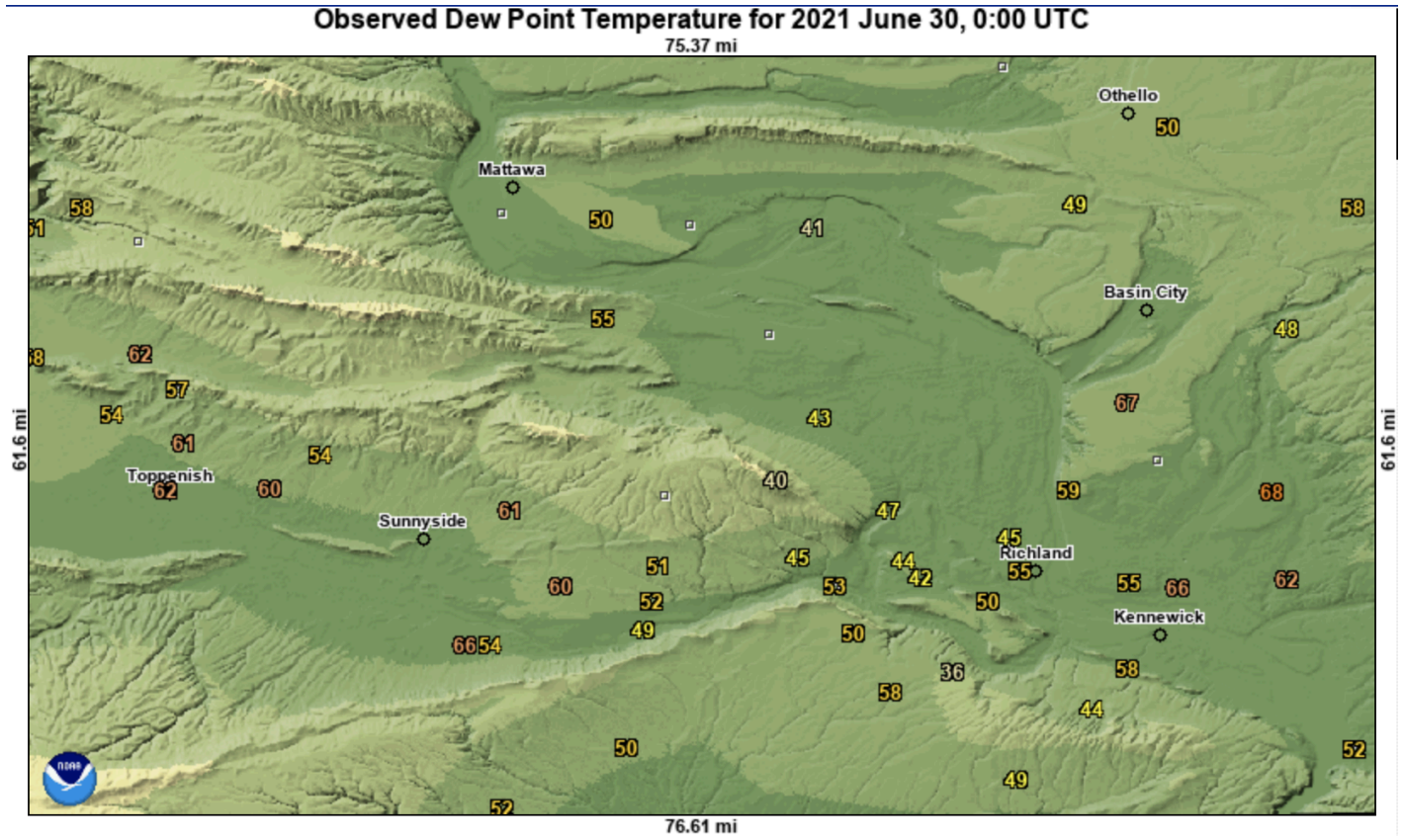 Temperature and dew point observations at 00 UTC 30 June (5 PM local time) from the lower Columbia basin are shown here in Figures 1 and 2. These maps were produced using the widget provided by NOAA’s National Operational Hydrologic Remote Sensing Center (NOHRSC) at https://www.nohrsc.noaa.gov/interactive/html/ map.html. The preliminary observations are from stations that are part of different networks and there are likely reports that are not represented here. The consistency associated with the temperature observations suggests they are reliable. There are considerably greater local variations in the reported dewpoints. Hotter locations were also mostly drier (i.e., lower dewpoints), both in comparing stations close to one another and in considering regional differences. Regarding the latter, the reports out of the Yakima Valley and lower Columbia basin close to irrigated fields were generally a bit cooler and more humid with the reports from south of the Wahluke Slope (stretching from near Mattawa to southwest of Odessa) indicating higher temperatures and lower dewpoints. It is not obvious which places had conditions leading to a greater heat stress on humans, which is why the WBGT can be useful. For selected locations, we chose representative values for the air temperature, dew point and wind speed, and found the resulting magnitudes of the WBGT and heat index (which does not account for the wind or insolation) using the NWS application mentioned above. The results are itemized in Table 2.