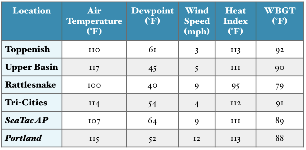 Table 2: Average air temperature, dewpoint, and wind speed for the locations listed from NOAA NOHRSC at 5 pm 30 June and the calculated heat index and wet bulb globe temperature. The values are representative of the locations selected rather than actual observations from individual stations. Reports from SeaTac and Portland Airport are also included; values here are from late in the afternoon on 28 June.