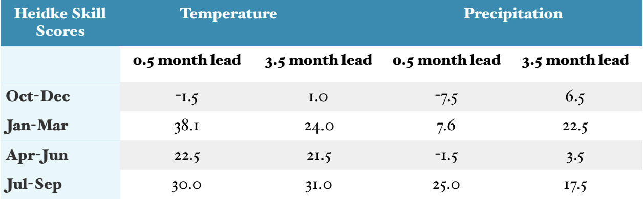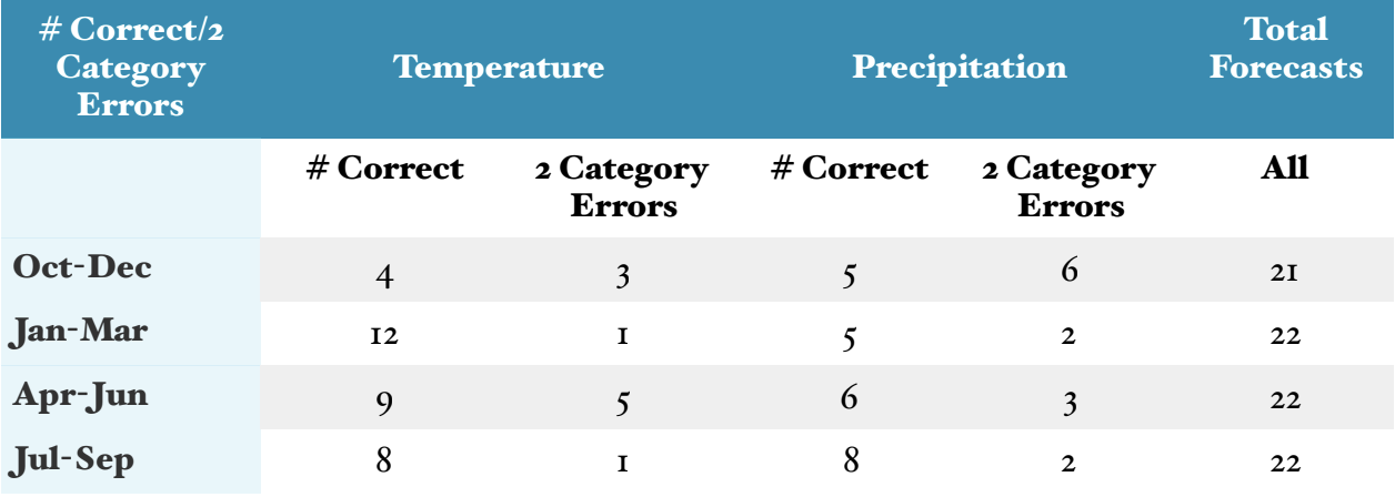 Some general conclusions can be drawn. First, seasonal temperature predictions tend to be more skillful than seasonal precipitation predictions, as found in previous studies (e.g., Peng et al. 2012). The overall difference in skill between the 0.5 and 3.5 month lead times was small, with the shorter time horizon yielding substantially better predictions only for temperature in winter and for precipitation in summer. For precipitation in winter, the longer lead forecasts were actually superior, but this is probably a fluke. The lack of skill is striking in the seasonal forecasts for both temperature and precipitation for the first three months of the water year (October through December). October through December 0.5 month lead precipitation forecasts had the highest number of Category 2 errors in the 1995-2016 time period as well (Table 2), though the temperature and precipitation 0.5 month lead forecasts for Jan-Mar had relatively few (1 and 2, respectively).
