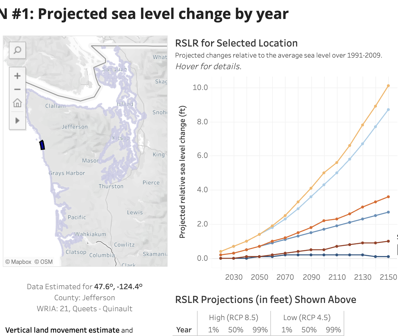 Description: View maps and graphs of projected sea level rise on Washington shorelines out to the year 2150. This tool takes into account gradual land subsidence/uplift.