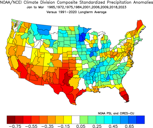 Map monthly, seasonal, and annual NOAA/NCEI U.S. Climate Division temperature and precipitation means, anomalies, and climatologies with the ability to average over multiple years, from 1895-present.