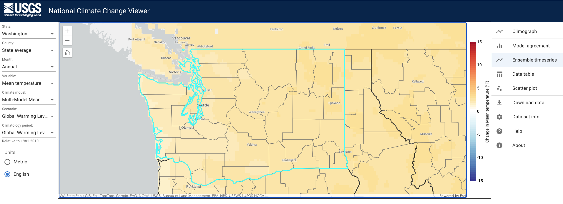Variables: Air temperature, Coastal water levels (Waves/Surge/Tides), Drought, Fire, Heat, Humidity, Runoff / Streamflow, Snowpack, Water temperatureFormats: Data, Graph, Map, Text descriptionTimeframe: Long-term projectionsSource: UW Climate Impacts Group Access Data