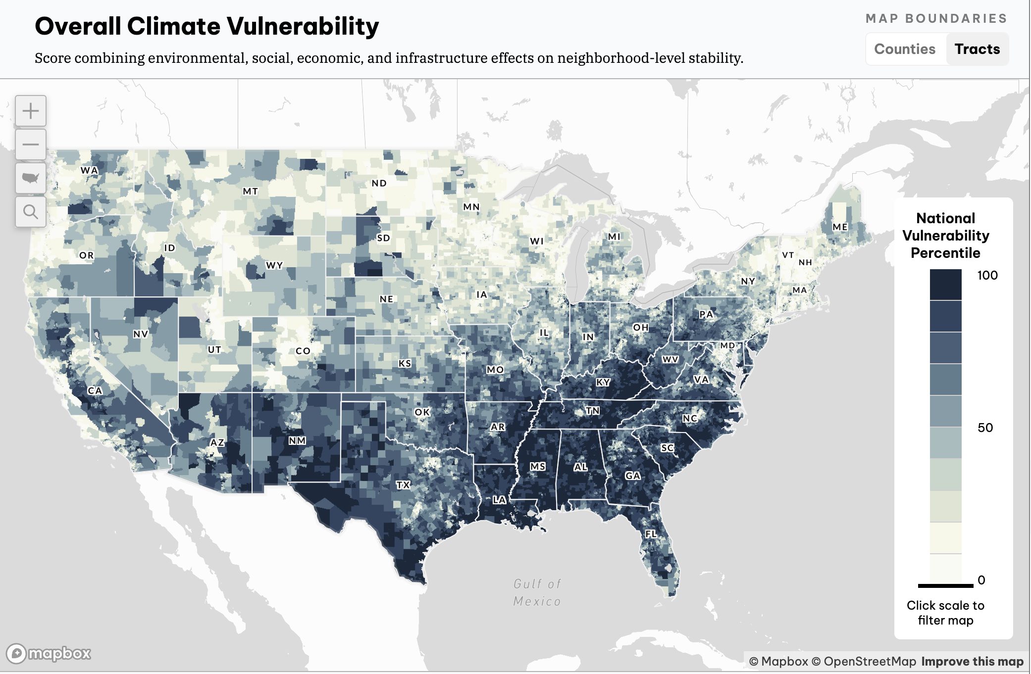 Description: View neighborhood-level climate risk and resilience derived from a combination of health, social, economic, environmental, extreme event likelihood, and infrastructure-related factors.