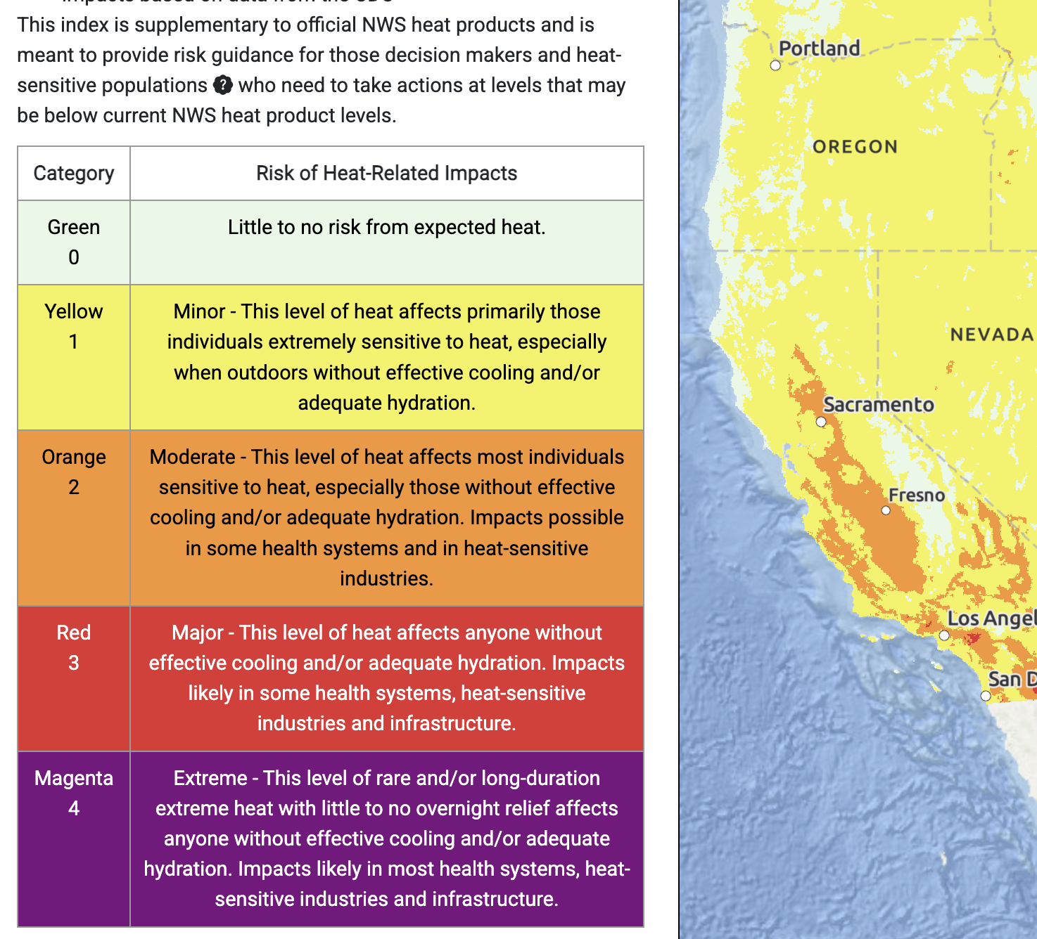 Description: View impacts-focused forecast maps of heat risk out to 7 days from the present. This tool is meant for use primarily by decision makers and emergency managers.