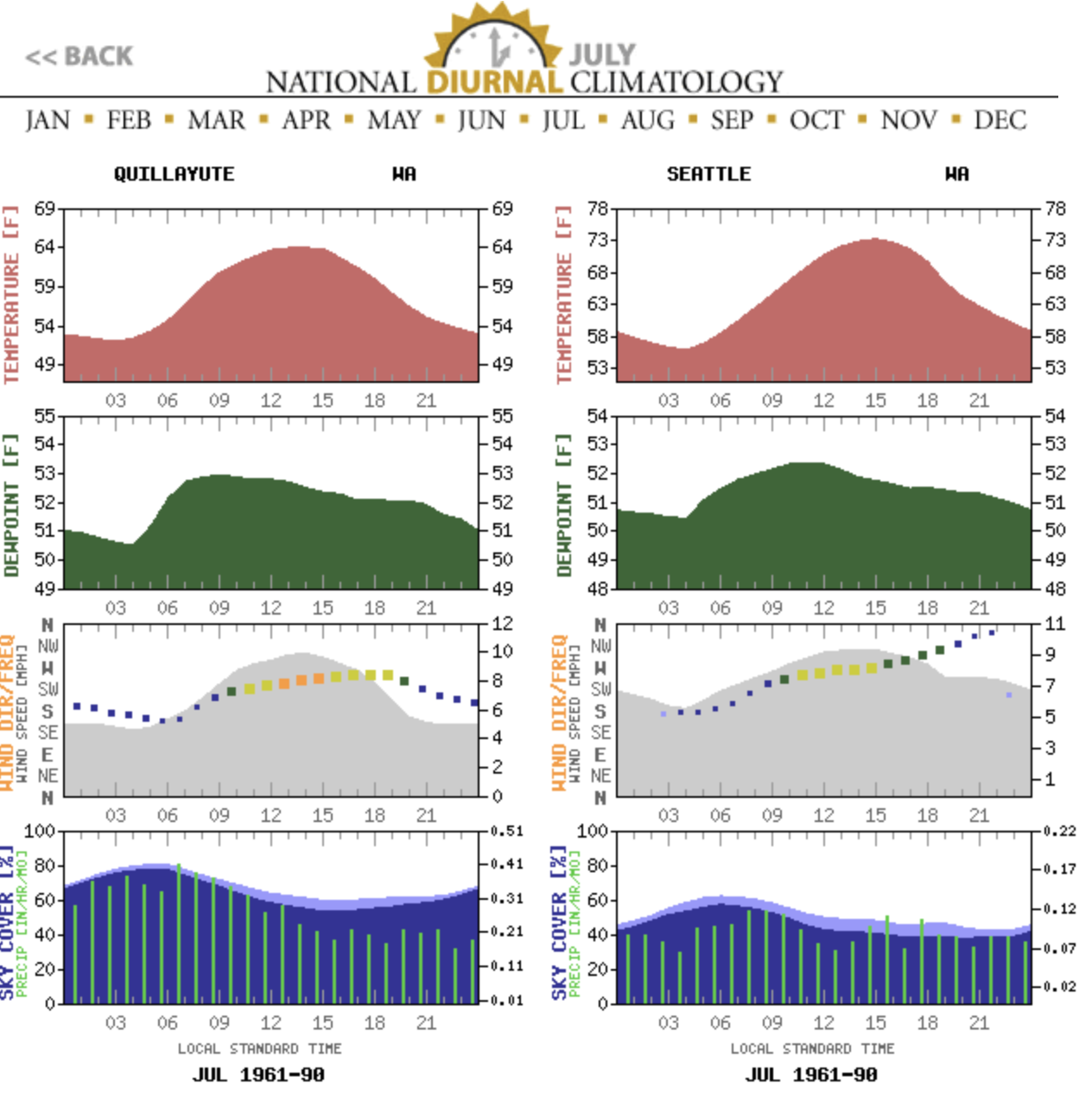 Description: Monthly graphs of hourly average temperature, precipitation, dew point, wind, and sky cover for 5 Washington locations averaged from 1961-1990 climate normals.