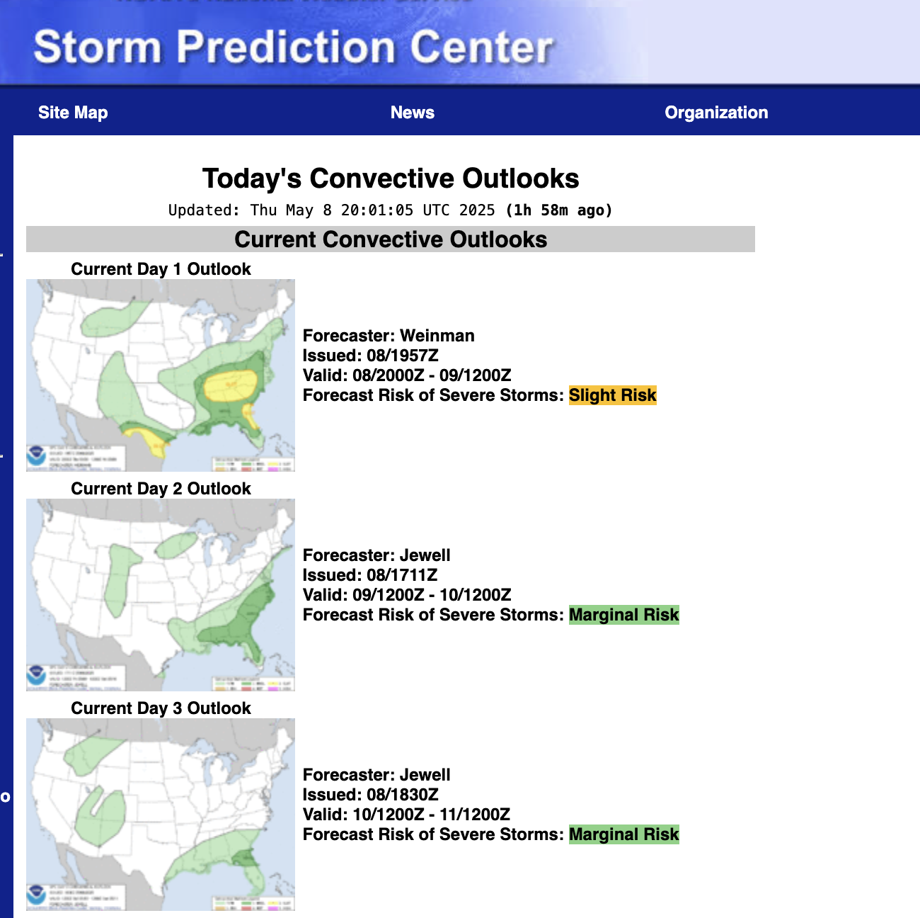 Description: View the current (Day 1) and upcoming severe weather forecasts from the Storm Prediction Center. These forecasts convey the probability of observing severe wind, hail, or tornadoes at a given location on the map.