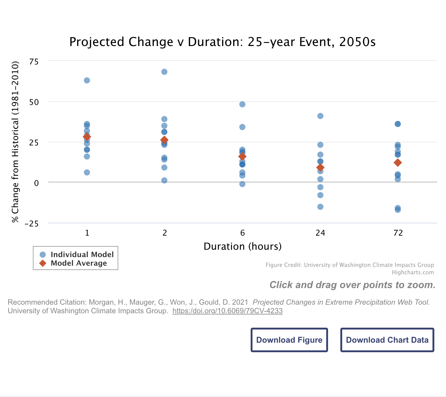 Description: View projected changes in extreme precipitation metrics across the northwestern contiguous US and far southern B.C. Projections are available for different rainfall event durations (from 1 to 72 hours) and return intervals (from 2 to 100 years).