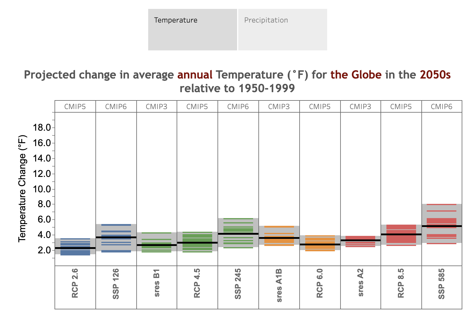 Description: Explore various climate model projections from different CMIP experiments of annual and seasonal temperature and precipitation. Data is available for the 2050s and 2080s relative to 1950-1999 averages.