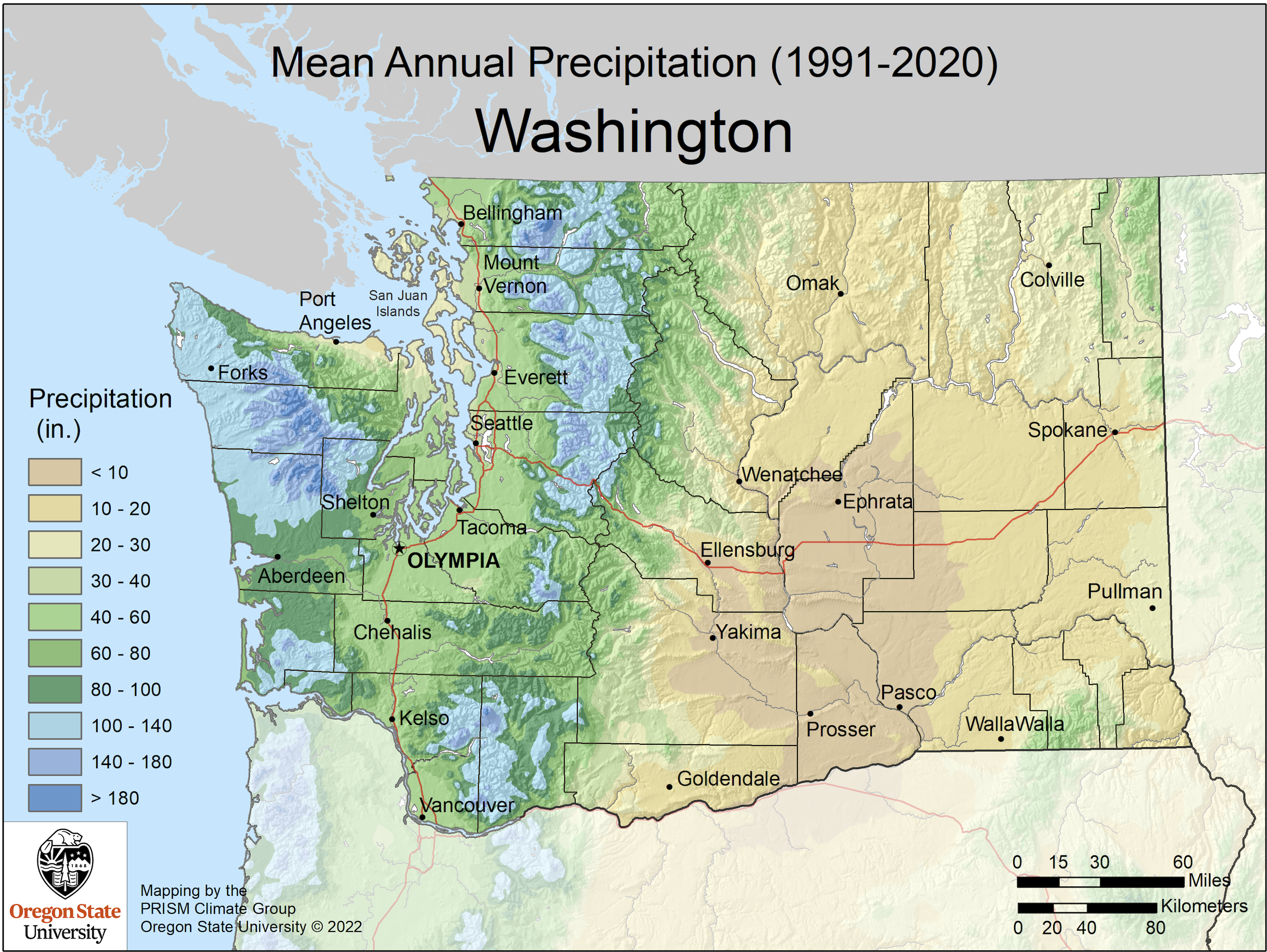Map of average annual precipitation (rain and snow) for Washington State (i.e., “climate normals”, 1991-2020)